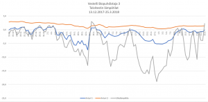 Testissä selvisi, että ulkolämpötilat vaihtelivat +3,0 °C ja -19,0 °C välillä (Ulkolämpötila – harmaa viiva), ollen keskiarvolta -8,8 °C:ta. Maan sisällä keskiarvolämpötila painuu noin -1,6 °C:ta pakkaselle (anturi 1 – sininen viiva), ja kylmimmillään pakkanen nousi jopa -7,4 °C:seen. Pintavesi Biopuhdistajan sisällä säilyy koko ajan plussalla, ollen keskiarvoisesti noin +1,6 °C:ta (anturi 2 – oranssi viiva).