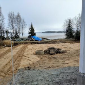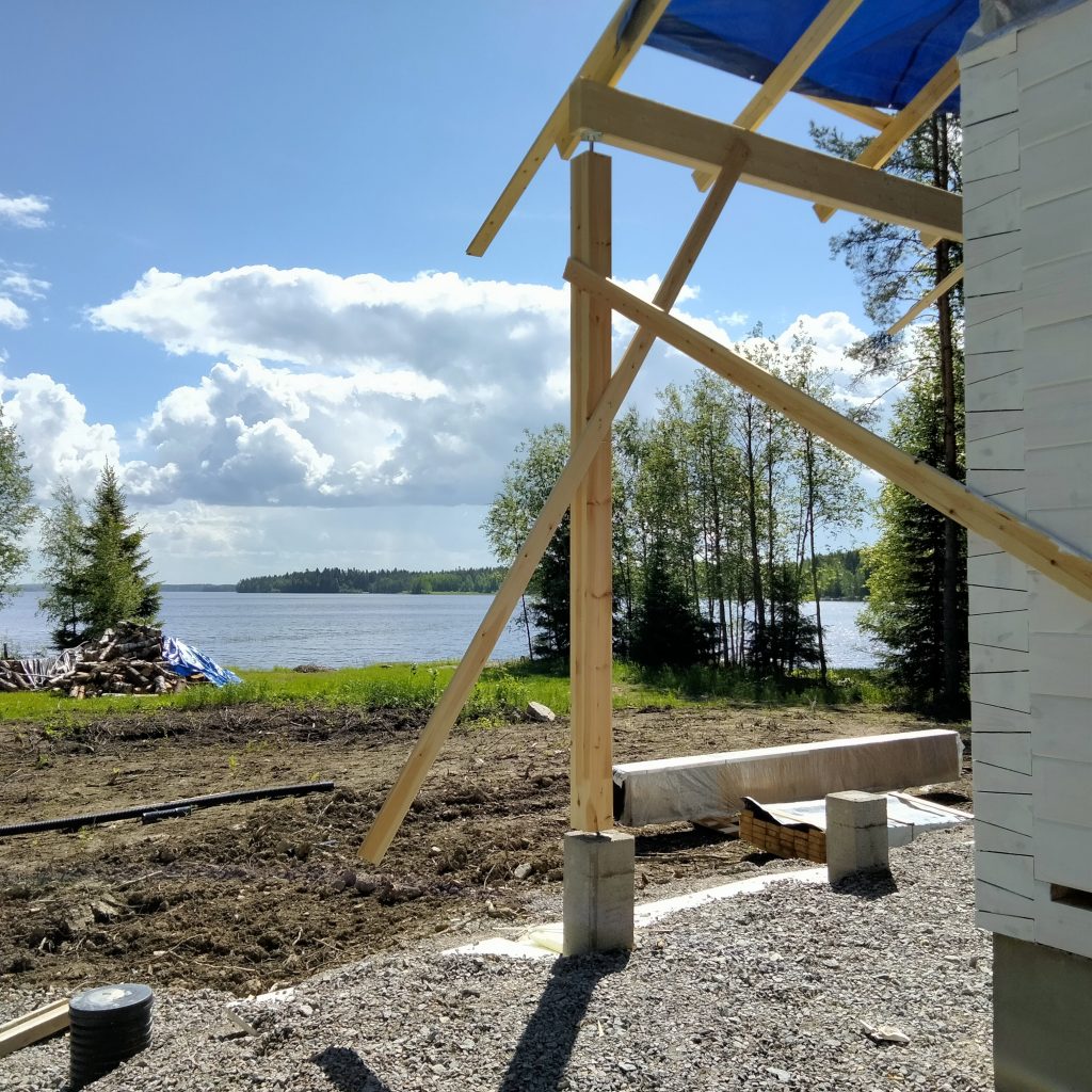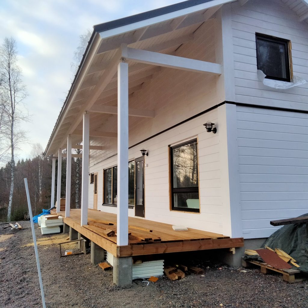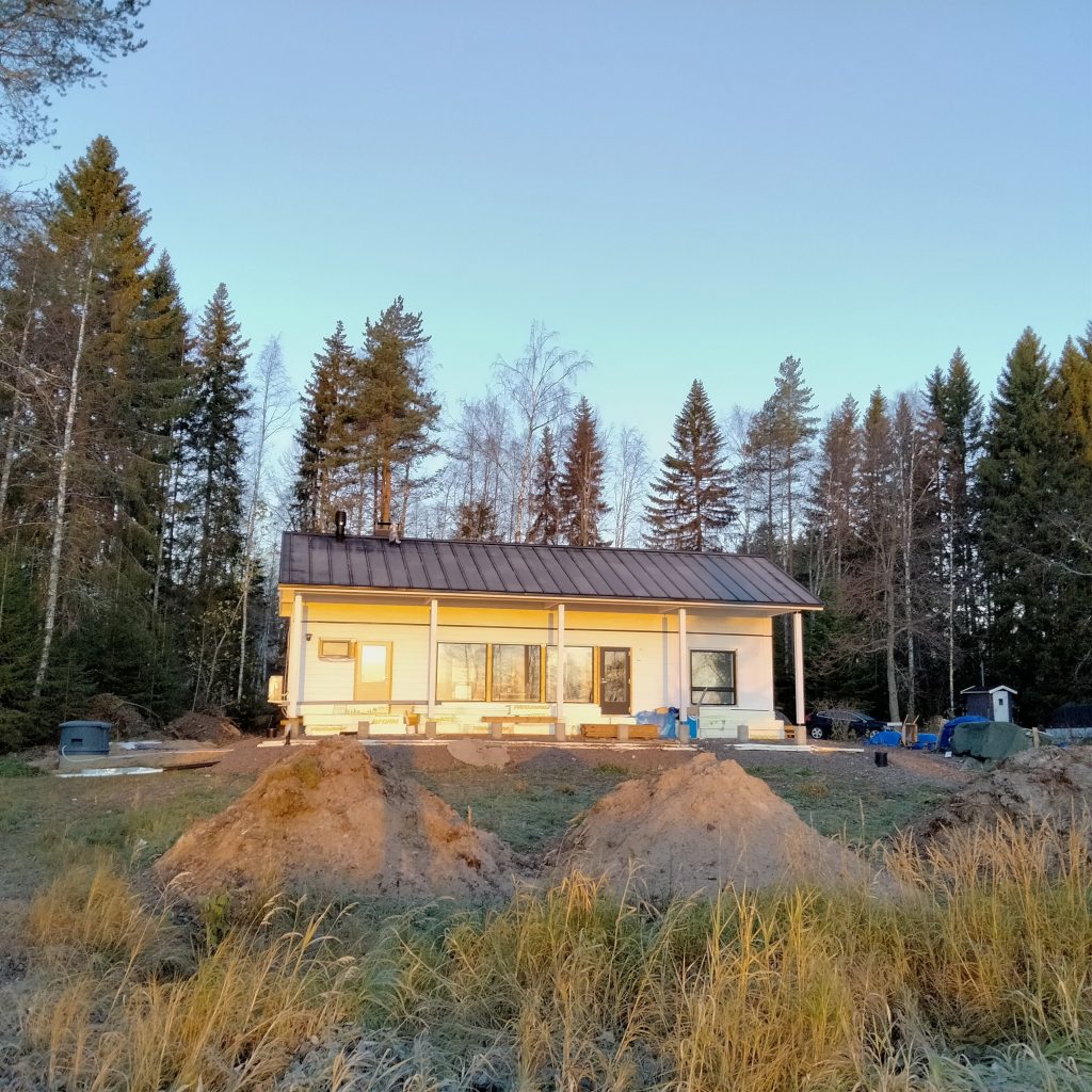 Rakennusprojekti alkoi kesällä 2021, kun tontilta kaadettiin noin 30 puuta ja lokakuussa maanrakennusurakoitsija kävi kaivamassa sorapatjat. Keväällä 2022 tuli toinen työporukka tekemään perustukset, jonka jälkeen päästiin rakentamaan. Juhalle tämä oli jo toinen rakennusprojekti ja hän uskoi pääsevänsä tästä projektista vaivattomammin. “Ajattelin, että selviäisin tällä kertaa vähän helpommalla, mutta ei se mennytkään ihan niin”, hän toteaa nauraen. “Tässä kaikessa on mennyt yllättävän kauan, mutta nyt olemme viettäneet loma-asunnossa jo useamman yön.”