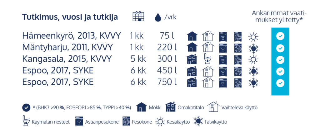 Kaikki testit on tehty puolueettomasti (KVVY tai SYKE) ja jokaisessa testissä Biopuhdistajan puhdistustulokset täyttävät kokonaisuudessaan hajajätevesiasetuksen (157/2017) ankaramman vaatimustason: BOD7 < 45 mg/l (vähintään 90 %), fosfori < 3 mg/l (vähintään 85 %) ja typpi < 76 mg/l (vähintään 40 %). Jaksottainen käyttö ei vaikuta Biopuhdistajan toimintaan. Biopuhdistajan puhdistustulokset ylittävät aina ankarimmat vaatimukset kaikissa olosuhteissa.