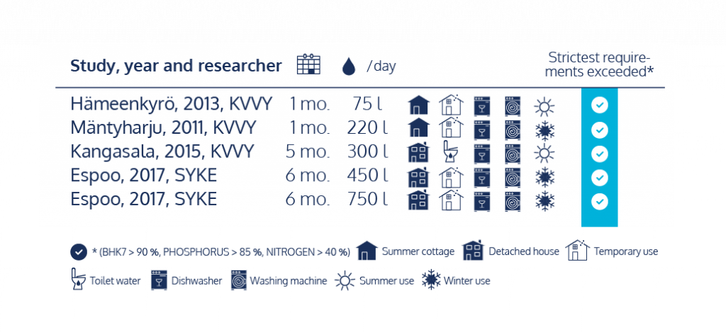 The Bioreactor has been studied in various locations (detached house and summer cottage use), in various conditions (summer, winter and temporary use), at various loads (75 l/day, 220 l/day, 300 l/day, 450 l/day and 750l/day) during the years 2011-2017.