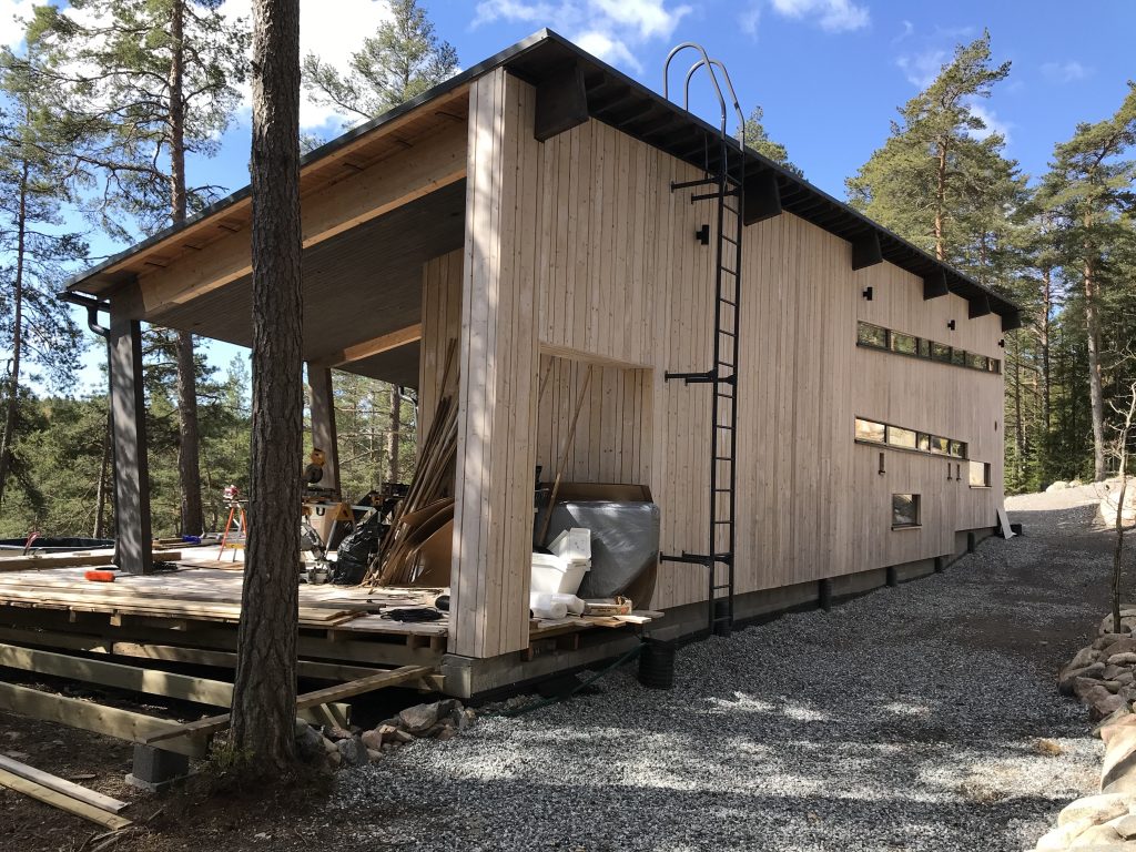 Projekti aloitettiin noin kaksi ja puoli vuotta sitten suunnittelulla ja luvituksella. Varsinaisesti talon rakentamisessa kesti noin puolitoista vuotta. Jari on tehnyt paljon itse ja esimerkiksi terassi on vielä kesken. Syksyllä pitäisi kaiken kuitenkin olla valmista, pohdiskelee Jari.