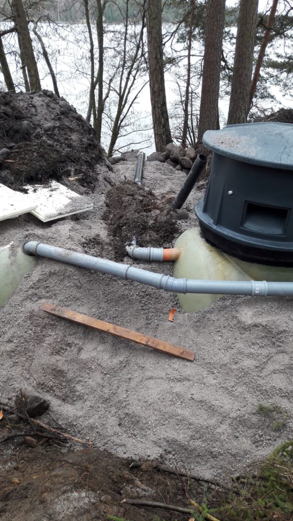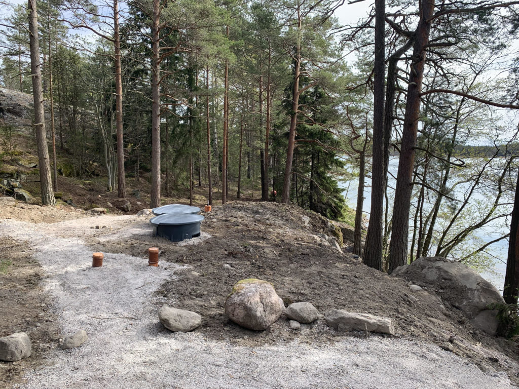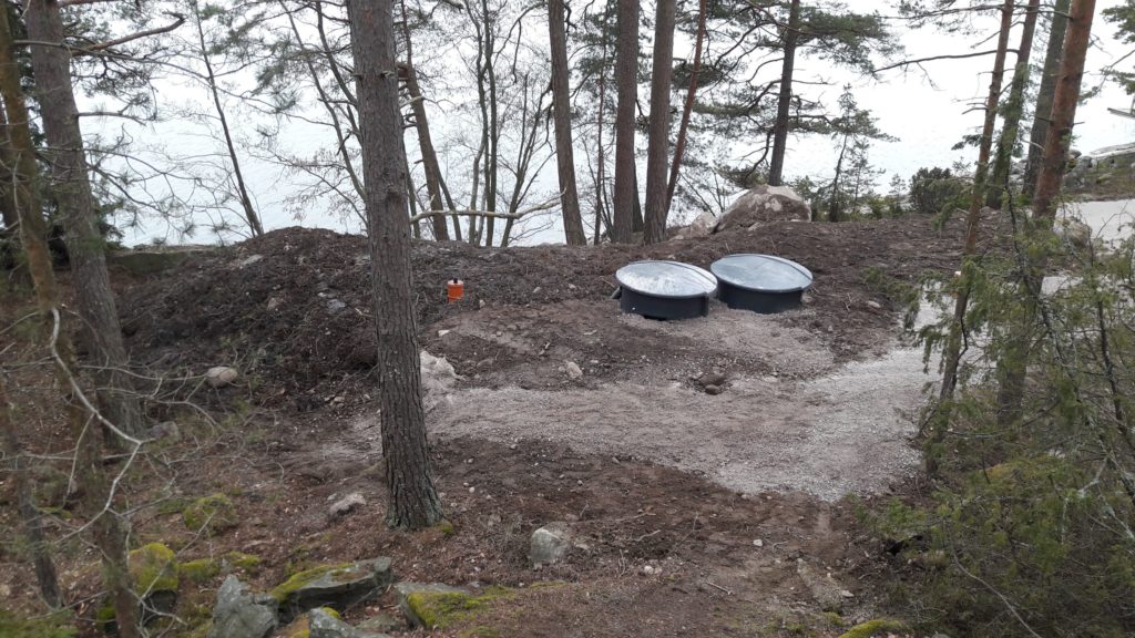 ”Risto Almonkari päivitti jätevesisuunnitelman 12m3 umpisäiliöllä ja Vestellin Biopuhdistaja 20:llä harmaille jätevesille. Korkeiden puhdistustulosten ansiosta järjestelmä saatiin sijoittaa lähemmäksi rantaa ja näin vältyttiin erillisten pumppaamoiden asennukselta, louhinnalta ja suurilta kaivuutöiltä. Uuden jätevesijärjestelmän tieltä kaadettiin vain muutama puu.”