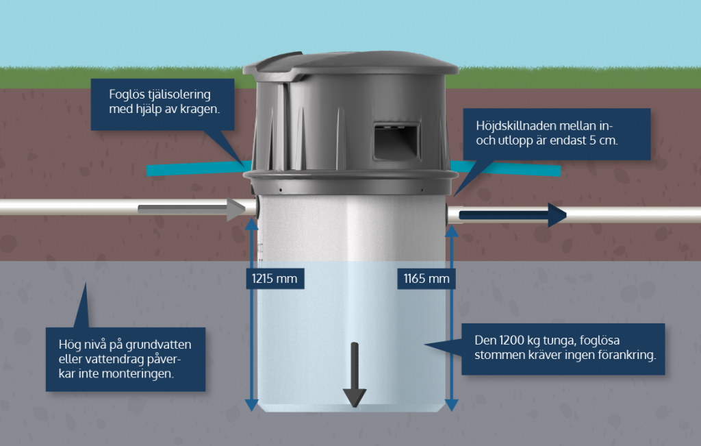 Vid installationen av Biorenaren placeras tjälisoleringen (ex. Finnfoam) mot den avsedda kragen och på så vis bildas en foglös isolerkonstruktion. Något annat behöver du inte göra för ett beprövat bekymmersfritt vinterbruk – även under extrema förhållanden.