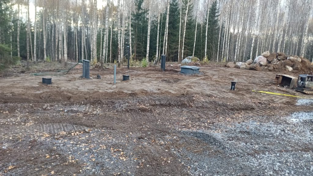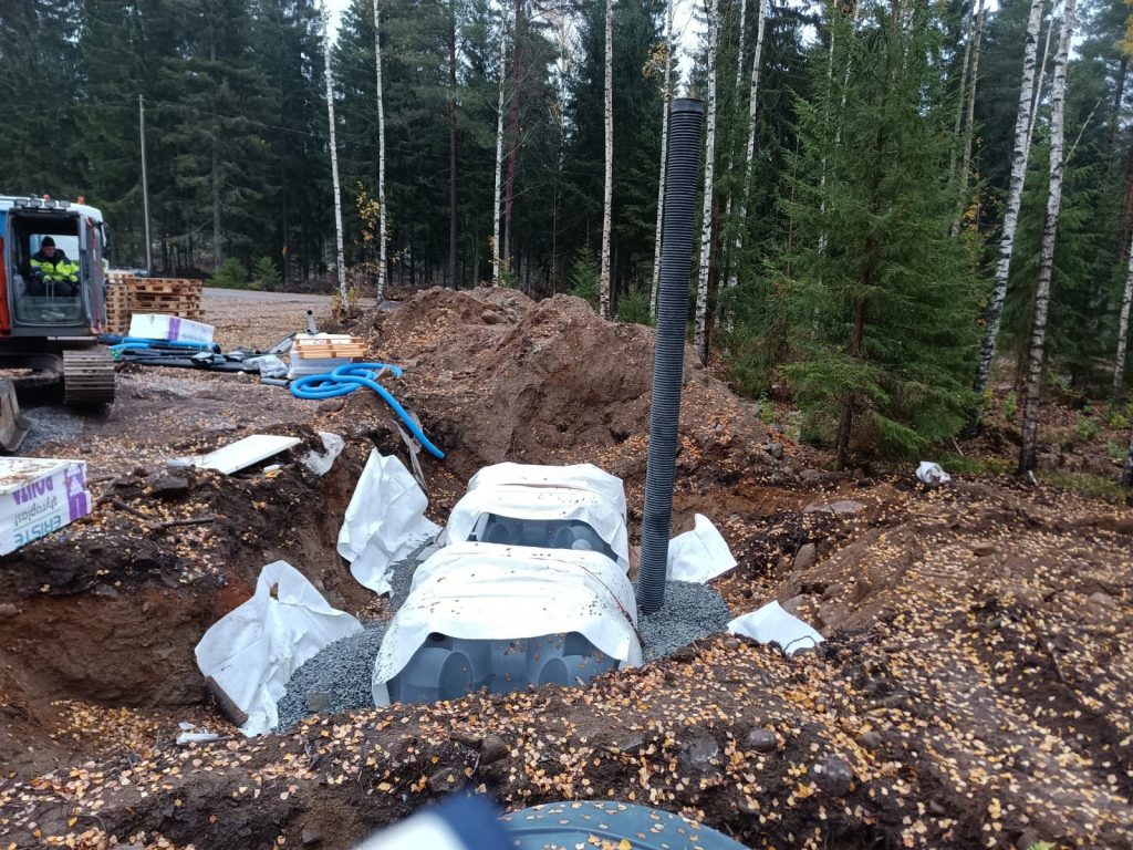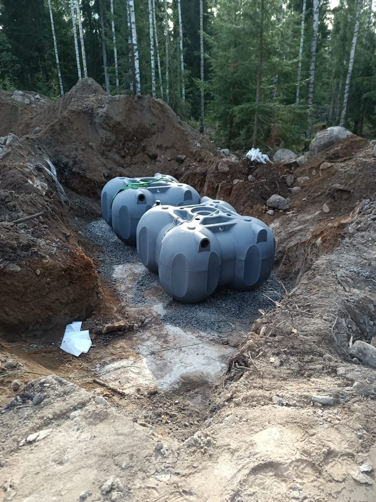 Nellan ja Tonin kiinteistölle suunniteltiin Vestelli Biopuhdistaja 3 -tuote harmaille vesille ja kaksi 5,5 m³ umpisäiliötä mustille vesille. Toni on toiminut maaurakoitsijana, joten hän luonnollisesti asensi tuotteet näppärästi itse. “Asensin jätevesijärjestelmät ja siinä kävikin hyvä tuuri, kun löytyi sopiva paikka pihalta eikä tarvinnut louhia. Saatiin putket hyvin sinne ja säiliöt oikeaan syvyyteen”, hän kertoo tyytyväisenä. “Pohjatöiden ohella asennettiin kahden miehen voimin vaiheittain myös jätevesijärjestelmä: putkien veto talolta umpisäiliöön ja Biopuhdistajaan”, Toni jatkaa.