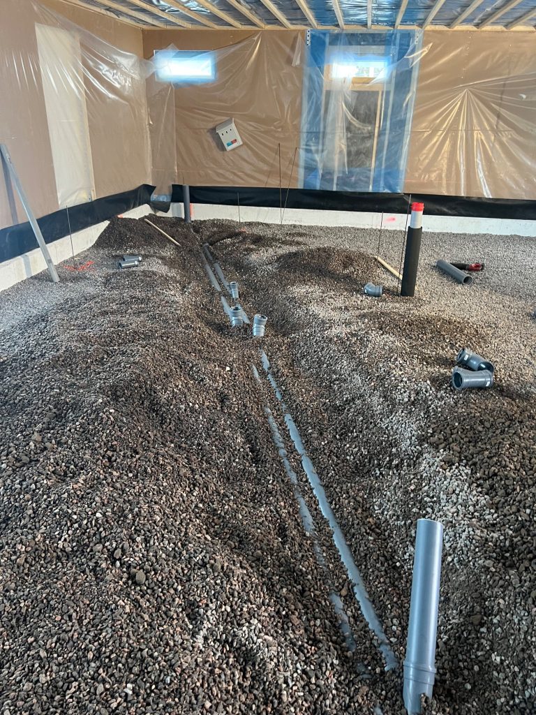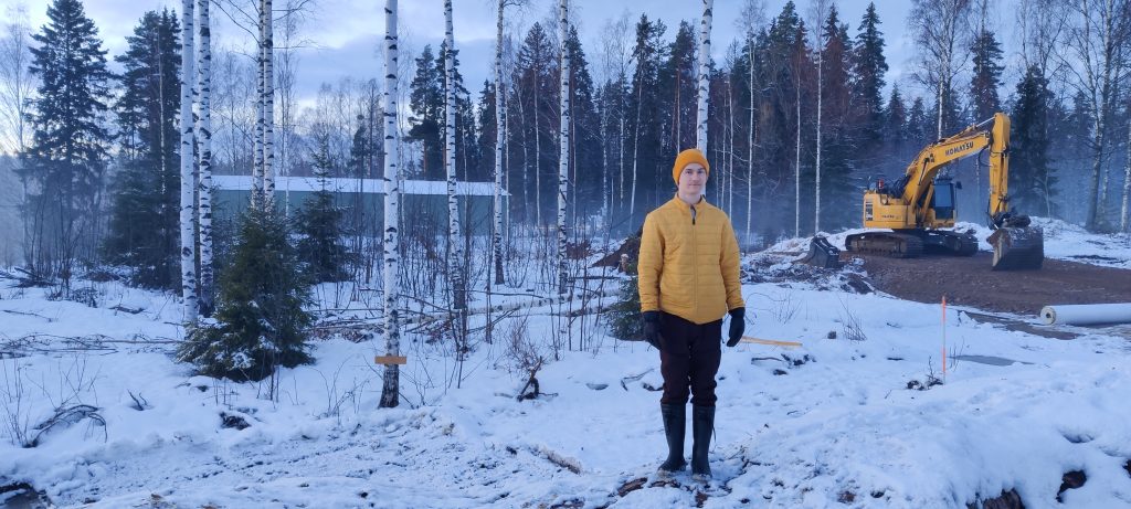 Rakennustyöt aloitettiin tammikuussa 2023 pintamaan poistolla, ja samassa vaiheessa alettiin suunnitella sopivaa jätevesijärjestelmää. Tontin maalaji on vaihtelevaa, moreenia, savea ja kalliota. Louhintaa tehtiin noin 500 m³, jotta talolle saatiin sopiva korkeusasema. Jätevesijärjestelmän umpisäiliöt, Biopuhdistaja ja maalämpöjärjestelmän keruupiiri saatiin kaivettua savimaahan.