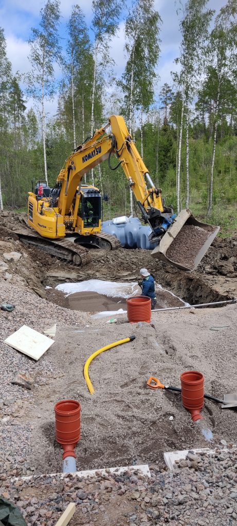 Jätevesijärjestelmä ja Biopuhdistaja asennettiin paikoilleen juhannuksen paikkeilla, joihin talosta tuleva tuplarunkoinen jätevesiverkosto liitettiin. Talousvesi tulee omasta kiinteistölle poratusta kaivosta. Itse rakennusprojekti eteni loppuun nopeasti ja ilman isompia ongelmia, ja syksyllä talo alkoi olla muuttovalmis.