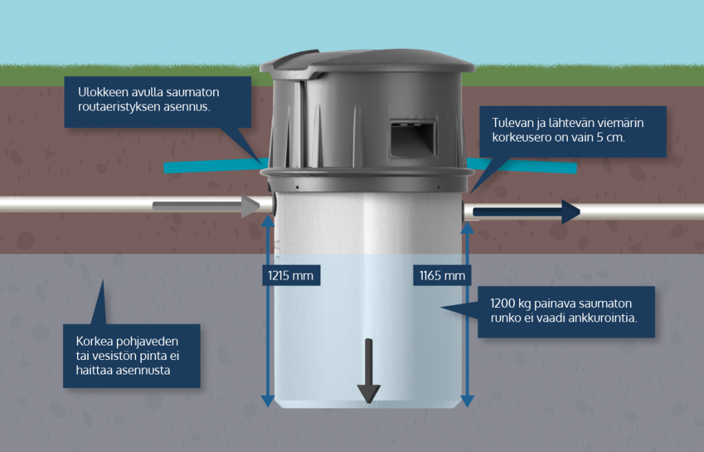Säiliö asennetaan maan alle tarvittavaan syvyyteen. Sen jälkeen muovinen yläosa voidaan nostaa paikalleen. Näkyviin jää vain siisti kansi.
